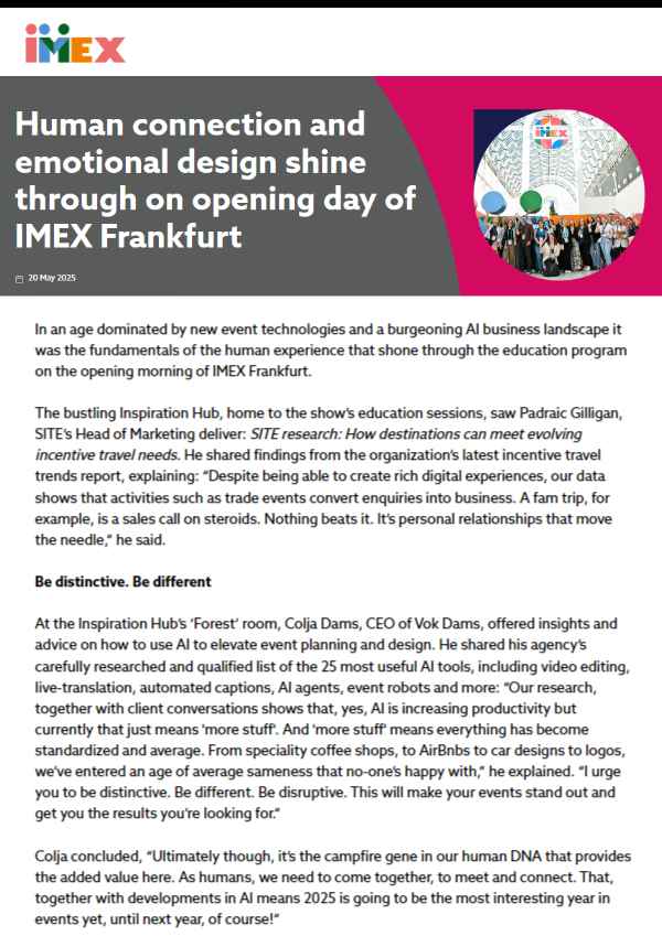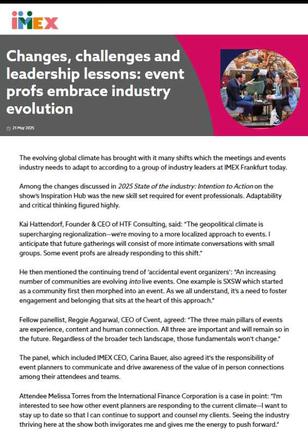 A unique collaboration between academia, event impact expert practitioners #MEET4IMPACT, AI events company Gevme and leading meetings destinations aims to help meeting owners and destinations to create unique impact reports on these events, making it relatively simple to plug a wide variety of large data sets into standardised reporting frameworks, for example “Theory of Change”…