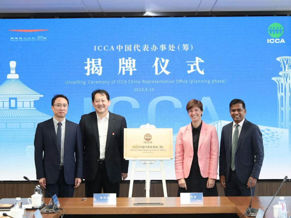 Unveiling Ceremony of the ICCA China Representative Office, L to R: Zhao Qizhou the Communist Party Secretary and Director of Beijing International Service Trade Affairs Center; Li Weidong Chairman of North Star Group; Marta Gomes ICCA President; and Senthil Gopinath, ICCA CEO