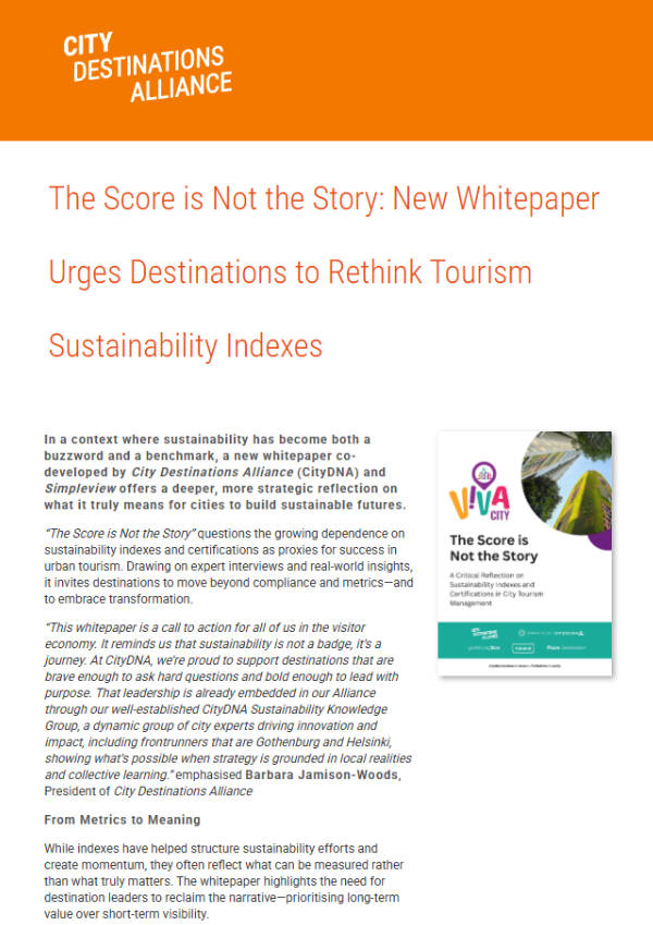 This White Paper produced by VivaCITY (a partnership between CityDNA and Simpleview / Granicus) examines the role, benefits and limitations of sustainability indices and certifications. With evolving EU regulation raising expectations and challenging both local policymakers and destination management professionals on destination sustainability standards and performance, this paper argues that these concepts are not ends in themselves, but rather tools for continuous development and improvement, and provide opportunities for invaluable industry-policymaker-citizen interaction.