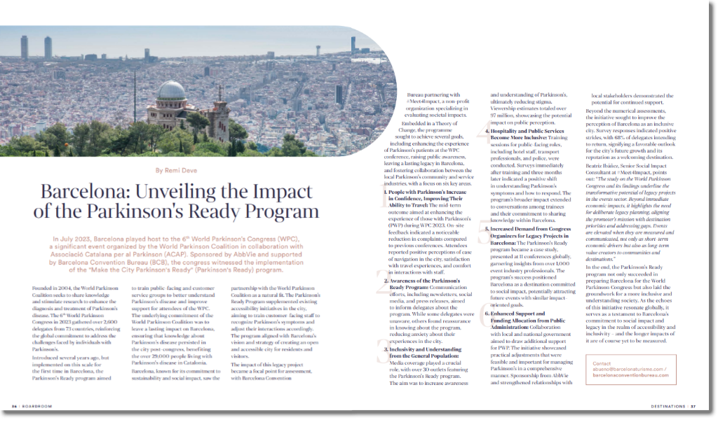 It is also a product of the serendipity of two wholly unconnected business events because the opportunity to capture the intended impacts of the WPC’s Parkinson’s Ready Programme – including preparing a city for the arrival of a forthcoming World Parkinson’s Coalition Congress – happened purely by chance when The Iceberg met with Anna Bueno, the Association Meetings Manager for Barcelona Convention Bureau at the GDS-Forum held in Valencia in October, and consequently WPC’s executive director, Elizabeth (Eli) Pollard the BestCities Global Forum held in Melbourne in January.