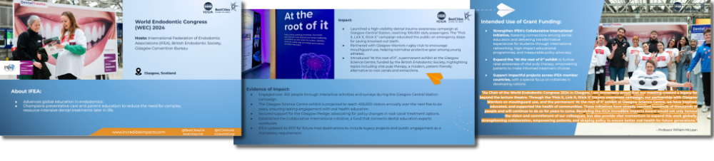 Hosted by the International Federation of Endodontic Associations (IFEA) and British Endodontic Society (BES), WEC 2024 in Glasgow, Scotland, harnessed creative, engaging activities to boost oral health awareness across diverse communities. Key legacies include a multi-year public exhibit, school-based educational resources, and the “Glasgow Pledge” promoting healthcare economic reform.
