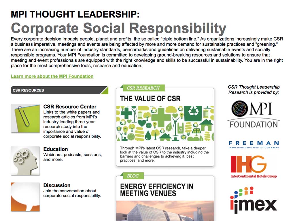 Every corporate decision impacts people, planet and profits, the so called “triple bottom line”. As organizations increasingly make CSR a business imperative, meetings and events are being affected by more and more demand for sustainable practices and “greening”. There are an increasing number of industry standards, benchmarks and guidelines on delivering sustainable events and socially responsible programs. The MPI Foundation is committed to developing ground-breaking resources and solutions to ensure that meeting and event professionals are equipped with the right knowledge and skills to be successful in sustainability. You are in the right place for the most comprehensive tools, research and education.