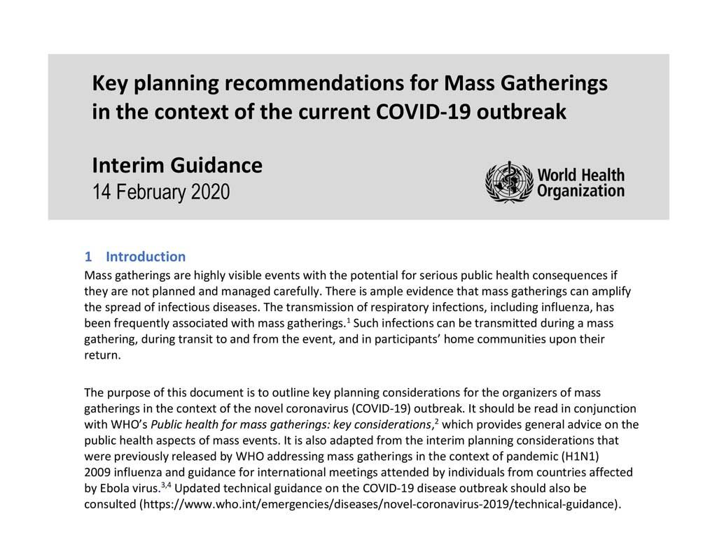 The purpose of this document is to outline key planning considerations for organisers of mass gatherings in the context of the COVID-19 outbreak. It should be read in conjunction with the World Health Organization’s Public Health for Mass Gatherings: Key Considerations, which provides general advice on the public health aspects of mass gathering events. It is also adapted from WHO’s interim planning considerations previously released for Mass Gatherings in the Context of Pandemic (H1N1) 2009 Influenza, and International Meetings Attended by Individuals from Ebola Virus Disease-Affected Countries.