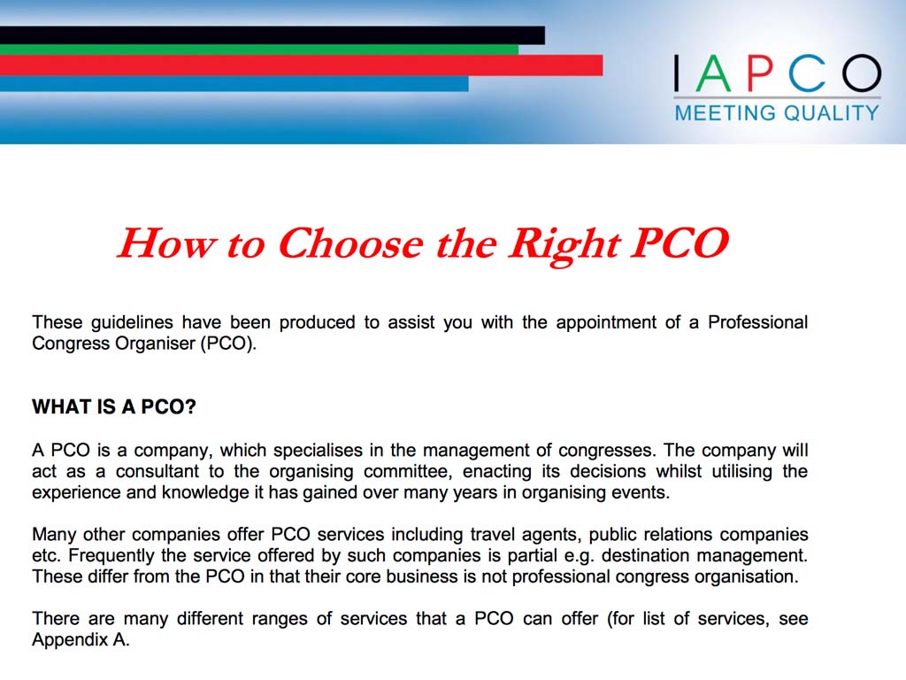Guidelines to assist an international association in the appointment of a Professional Congress Organiser (PCO) for their meeting.