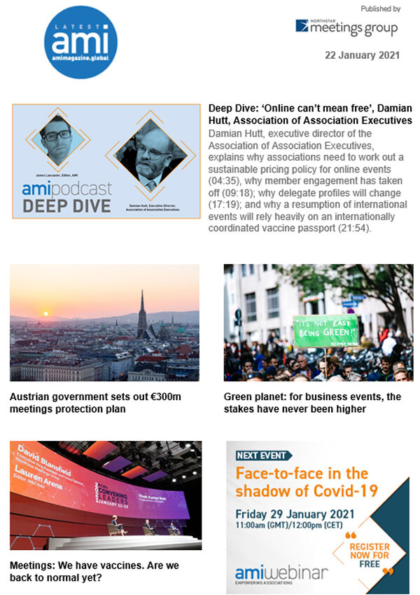 AMI editor James Lancaster talks to Damian Hutt, Executive Director of AAE (the Association of Association Executives), which runs Associations World Congress, about pricing for online events, engaging members, changing delegate profiles, as well as why resumption of international events will require a global vaccine passport. From Association Meetings International…