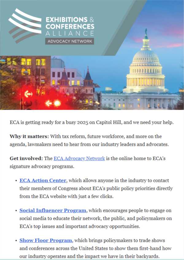 A record-setting group of 170 business and professional events industry leaders and advocates from 30 states met with more than 130 elected officials on Capitol Hill today as part of the Exhibitions & Conferences Alliance’s (ECA) annual Legislative Action Day. “What happens in Washington, DC is critical to the competitiveness of our industry going forward,”…