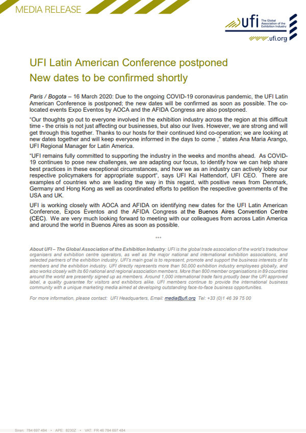 Iceberg partner UFI has released the first economic impact assessment on global exhibitions and trade shows of COVID-19. At least €23 billion ($26.3 billion) total worth of contracts have not concluded with shows not taking place as planned. The industry’s economic output in total is down €14.4 billion ($16.5 billion). From UFI…