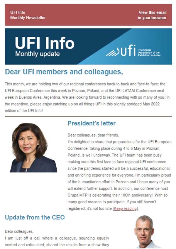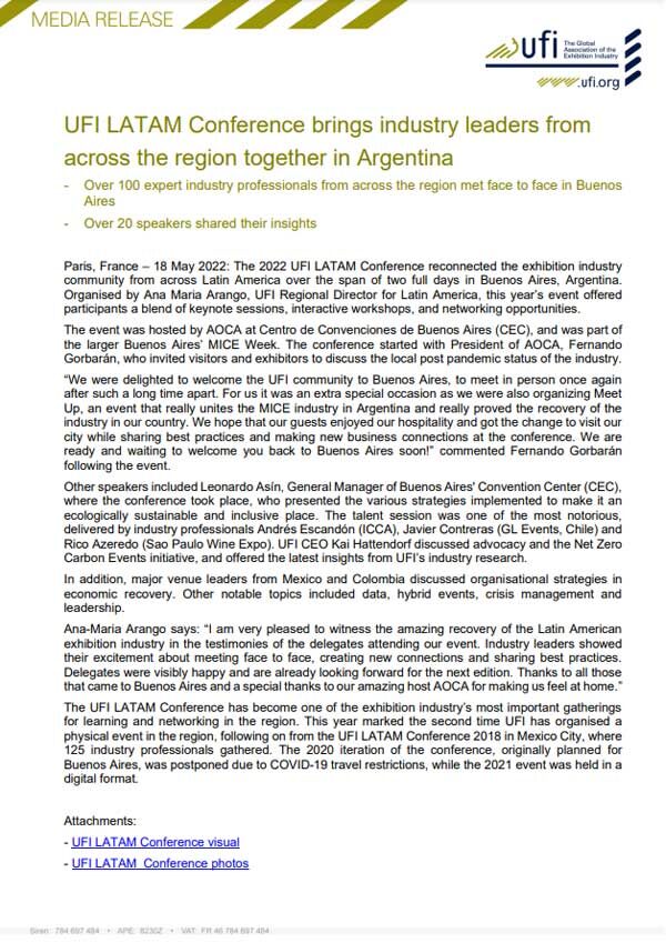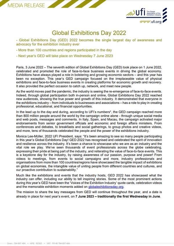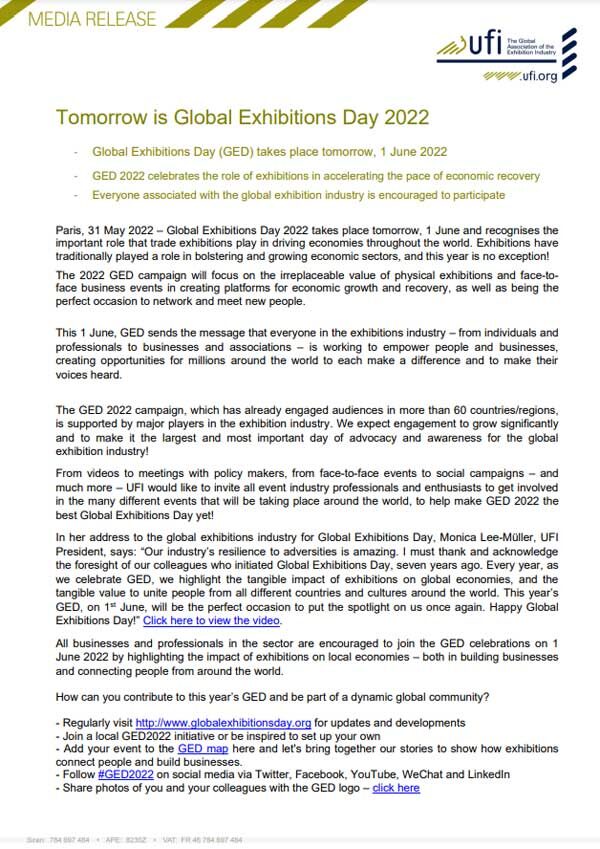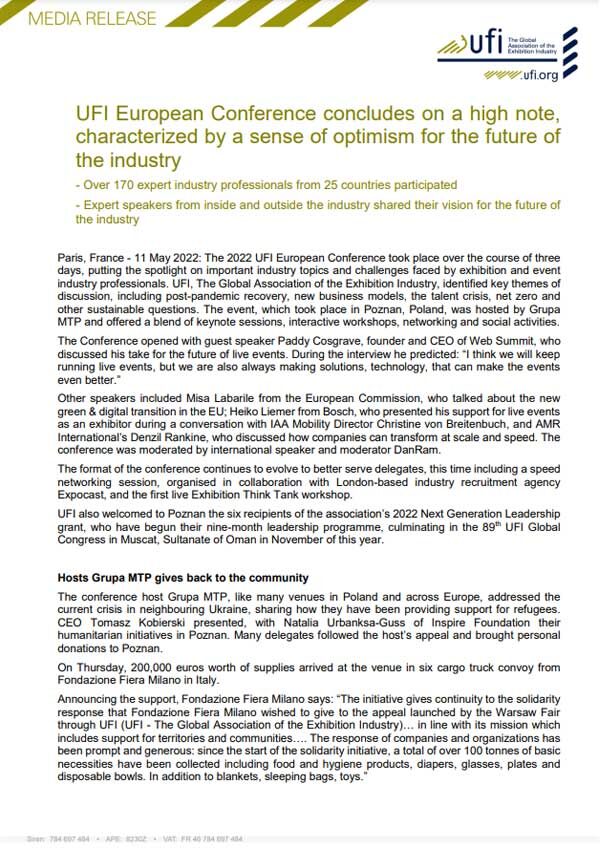 (Open to UFI members only.) UFI’s annual Global Congress is known as the exhibition industry’s largest global meeting of the year, combining international networking with unique content. It is an ideal opportunity for members to gain insight into topics of strategic interest, on the current industry trends and challenges that the exhibition industry is currently…