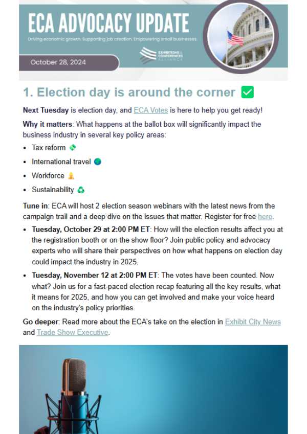 The Exhibitions & Conferences Alliance (ECA), the unified advocacy voice of the business events industry, announced that its 2025 Legislative Action Day will take place in Washington, DC on Thursday, May 29, 2025. ECA’s 2025 Legislative Action Day will bring leaders and advocates from across the business and professional events industry to Capitol Hill in…