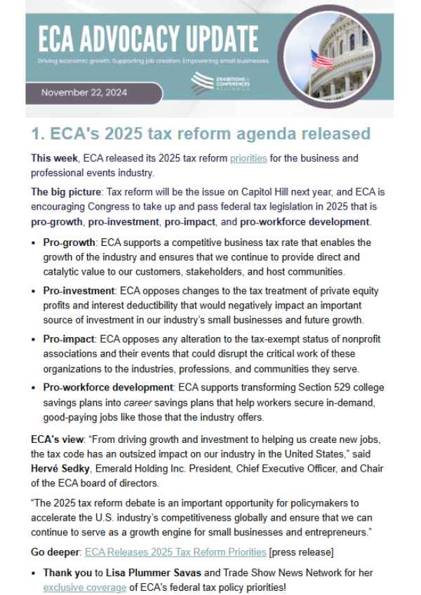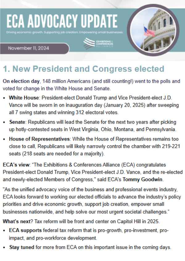 With the 119th Congress taking office tomorrow, and President-elect Trump being sworn in later this month, the Exhibitions & Conferences Alliance (ECA) has released its 2025 public policy agenda. ECA’s alliance partners and board of directors have identified five key areas of focus for 2025 that will drive the future competitiveness of the US business…