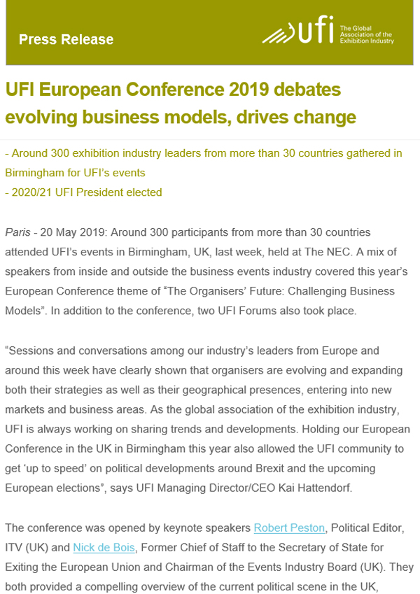 Over the past 14 years, the UFI Asia-Pacific Conference  has become one of the exhibition industry’s most important gatherings for learning and networking. Each year, the UFI Asia-Pacific Conference attracts around 300 leaders from organisers, venues, associations, service providers and government bodies. The next edition of the UFI Asia-Pacific Conference 2020 will take place in…