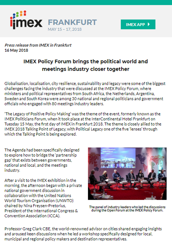 The Policy Forum takes the success of its previous incarnation, the Politicians Forum, to the next level, bringing policy makers together with influential industry leaders to engage national and local governments in the advancement of our industry. Part of our strategy to create a positive legacy. Our advocacy partners are AIPC, ECM, ICCA, JMIC, The…
