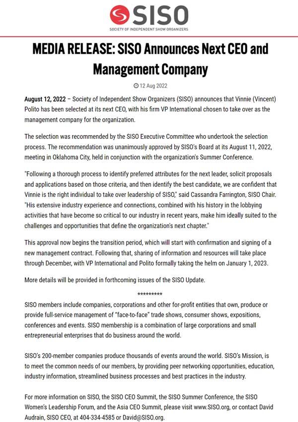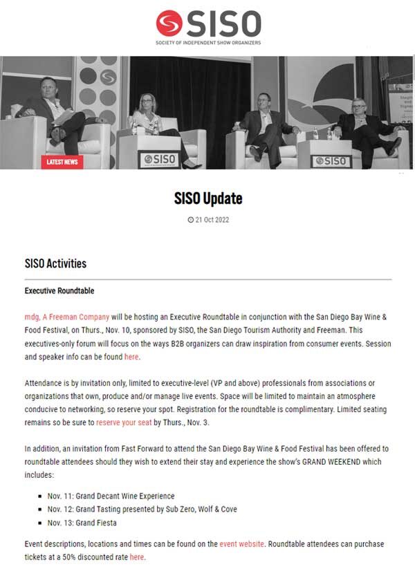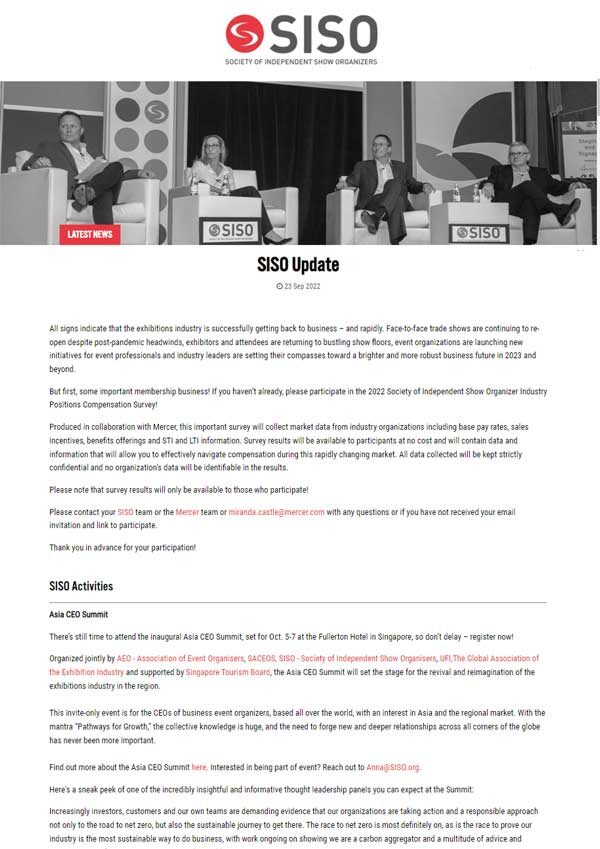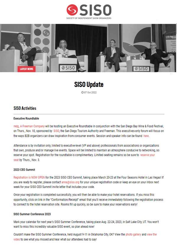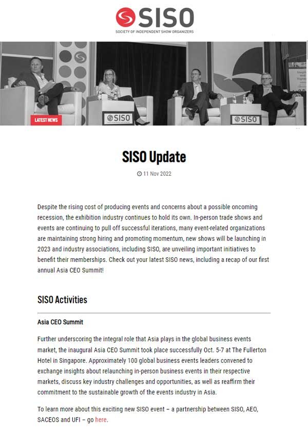 The must-attend leadership event for the for-profit show organizer. Register your interest for the SISO Summer Conference. “Without a doubt the most valuable three days of the year for networking, learning, and meeting colleagues.”